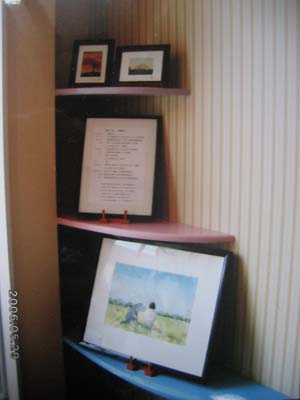 終了後になって 二階部分の写真をほとんど 撮ってなかったことに気付きました ここの3枚も こぬれさんからいただいた スナップです 子供部屋のスペースと リビング吹き抜け部分の一角です この他にロフトの シアタールームがあったのですが 写真が残せませんでした これも残せませんでしたが 子供部屋の壁には 三枚の絵を飾ることが出来ました モデルハウスなのに今回のためにと 釘を打ってくれたのです おまけに打つ場所を間違えて 穴だらけになってしまって・・・ |